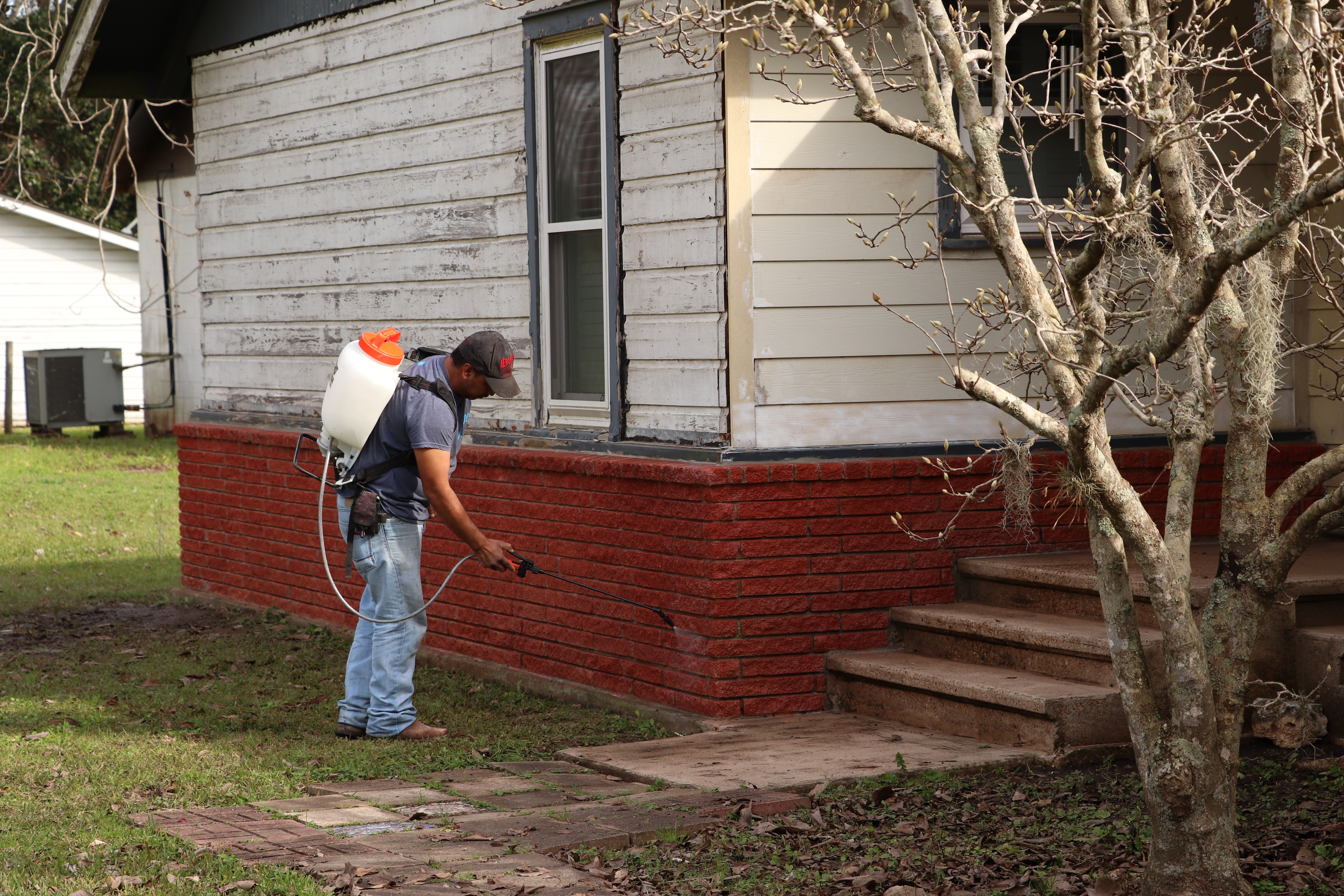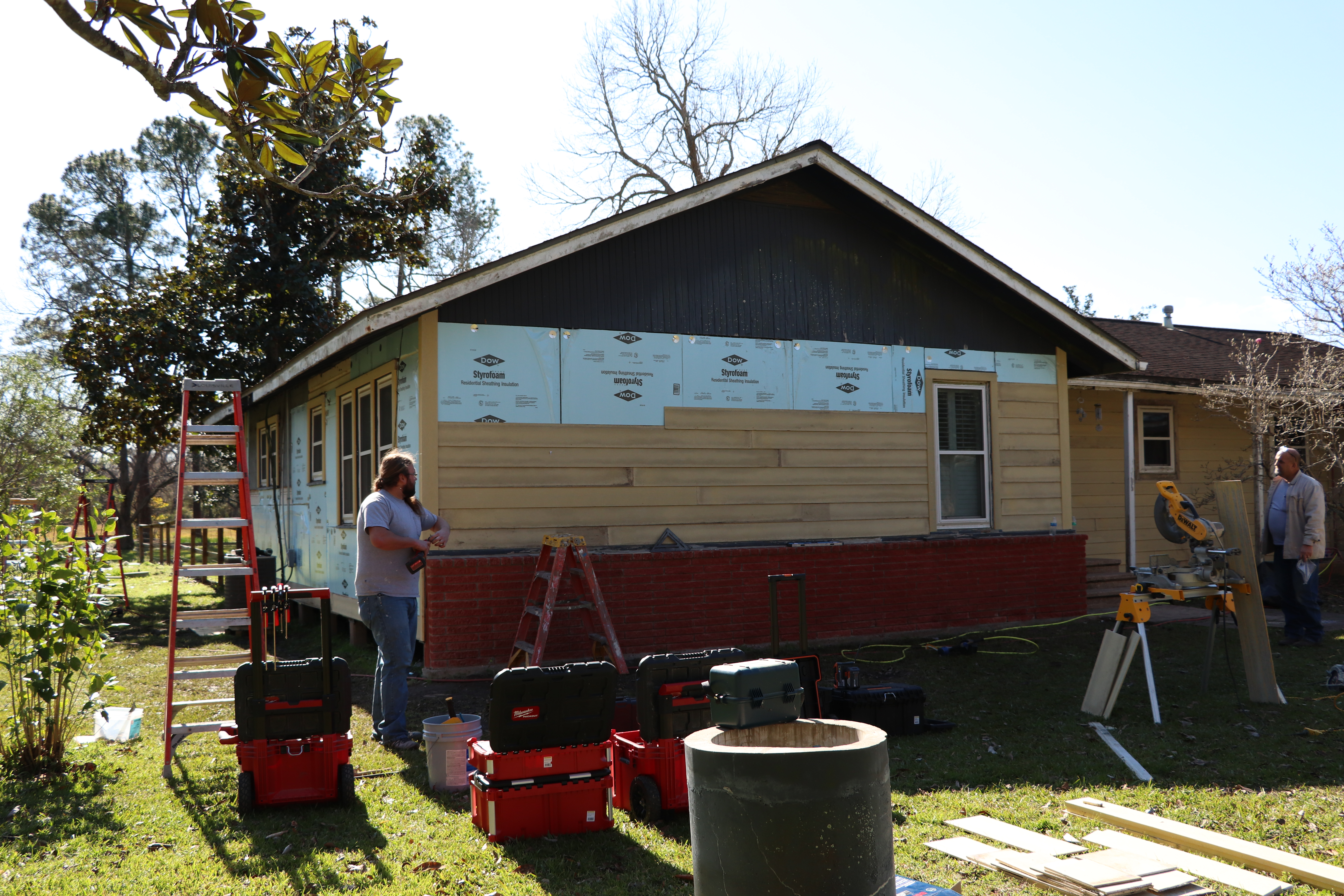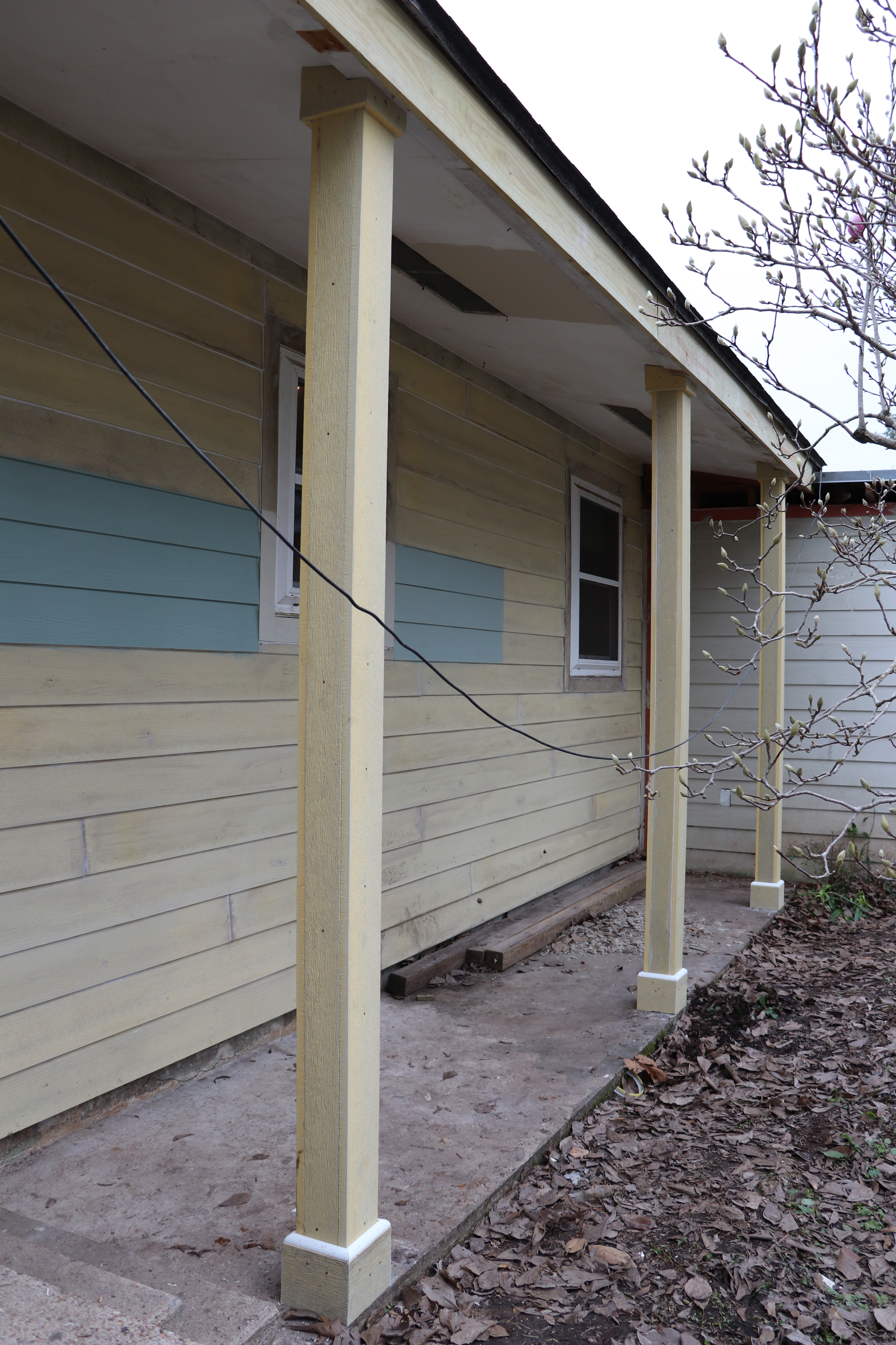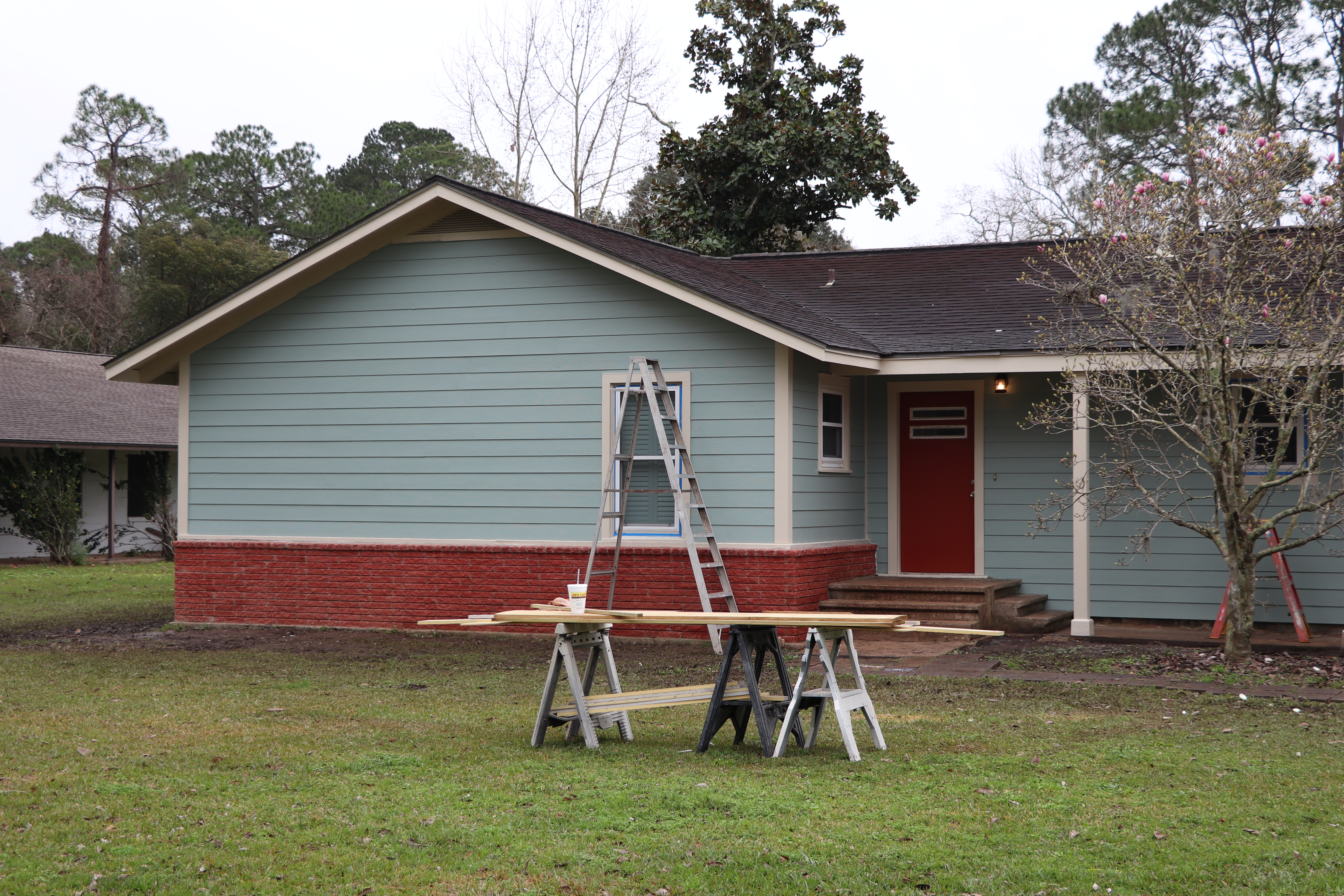 Sad little house — we originally planned to have the brick stained to match the trim color we planned, but after they pressure washed it, we reconsidered. I’m glad I was there to see how good it looked before they stained it!It’s looking so much better. He is sealing the brick so it holds its color better over time.New Hardiplank over foam insulation. This side of the house gets COLD in the winter, so we are hoping this will help.This used to be the front of the house before the original owner turned it sideways and added on. That little window over the a/c compressor is a bathroom now, but it was the front door!I noticed this out the brand new backdoor a few days ago. Beautiful.Repairing rotten wood and putting in new porch posts.They used to be skinny posts – we really like the simple way our builder dressed them up for us.Of course, there’s always a surprise. The flat roof over the garage had a hidden leak. This has been repaired and Monday we are having a new roof put on the garage.New backdoor and painting coming along!First coats of paint are almost done. I am so happy with how everything is looking. Look at our red door!!!