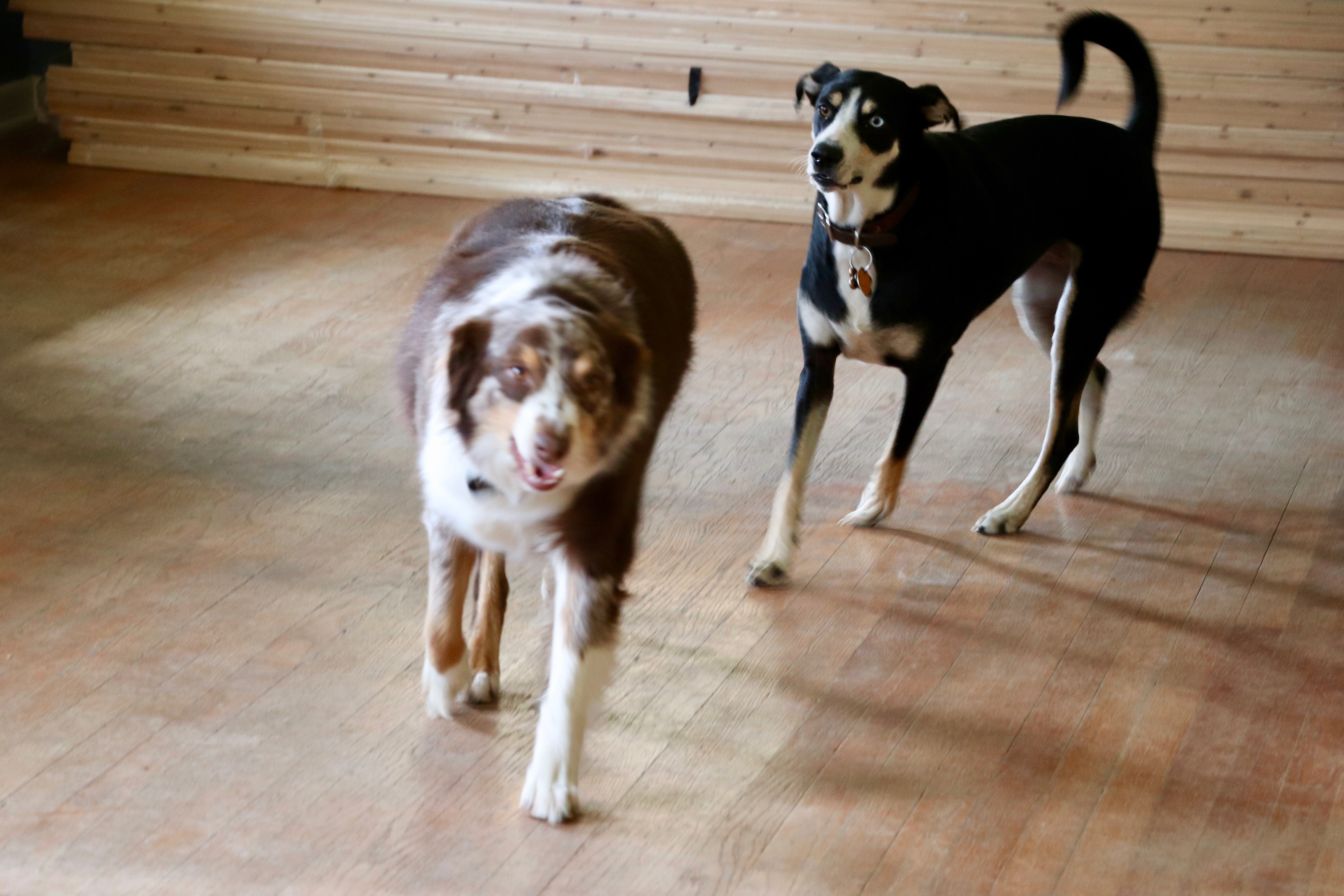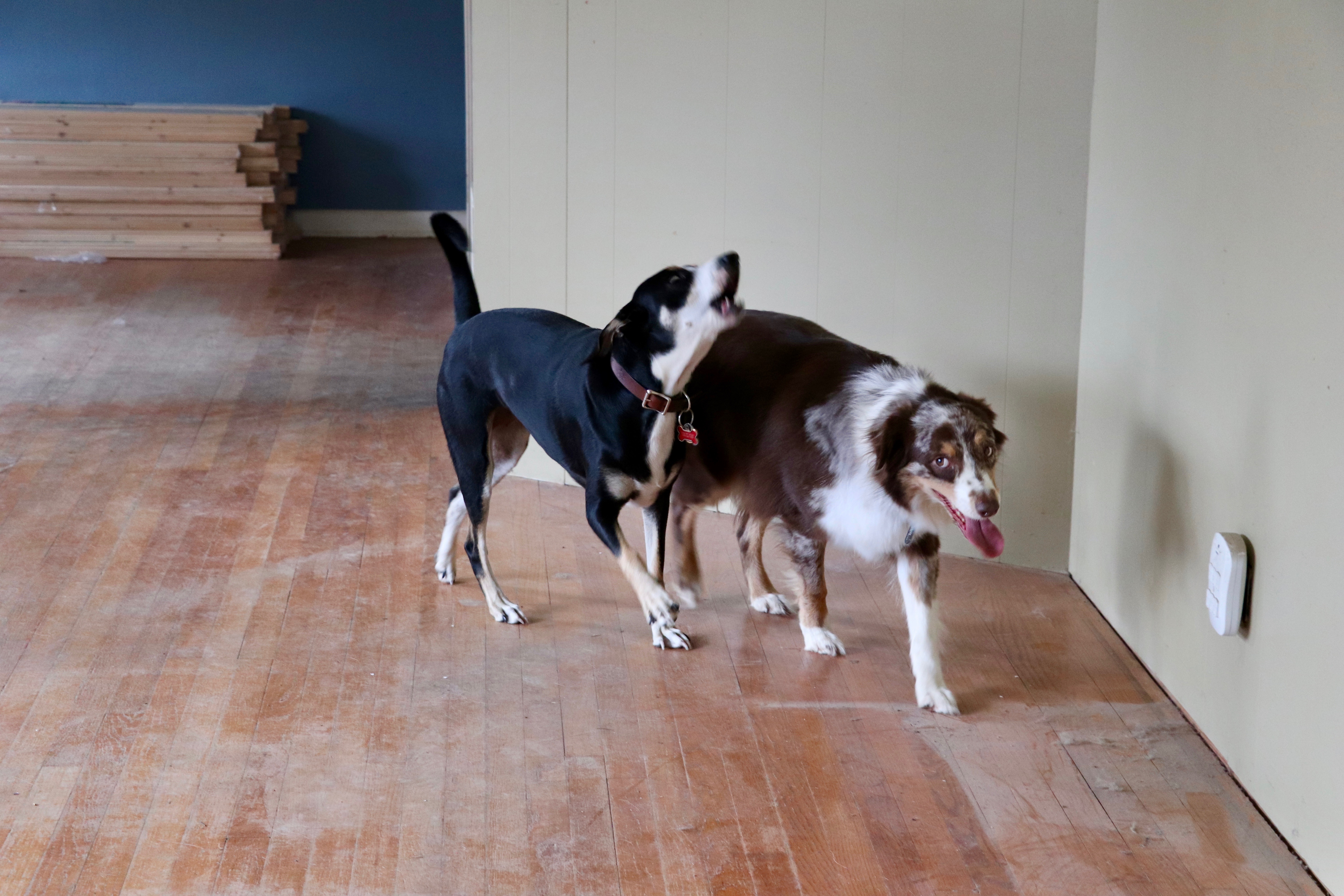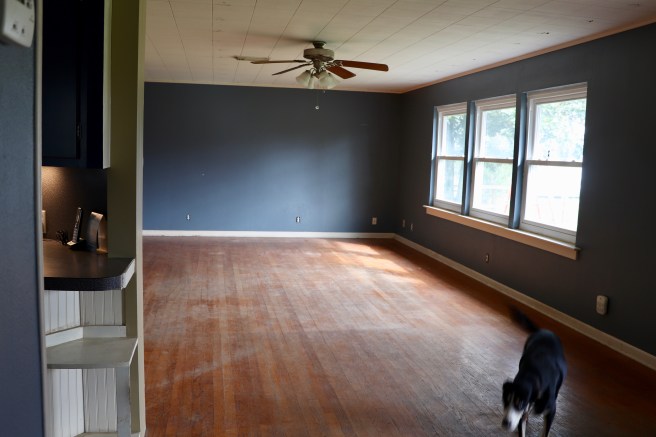 This is what started the whole ball rolling – a soft spot in our kitchen floor (tile has been removed) – we were worried that our subfloors were rotten.After our crew removed some of the old flooring, it was determined that the damage was actually minor, and probably the result of someone spilling a glass of water at some point in history and it seeped under the vinyl tile.There are a few of these spots, though, so the plan (part of which has been executed) is to remove the plywood subfloor, leave the shiplap (or whatever that stuff up there ^^^ is called), lay hardiboard over that with a vapor barrier, and then install our new flooring.While some of the guys were working outside on Monday, other guys were inside marking the studs behind this wretched accoustical ceiling tile. Chalk lines were popped in preparation for our new ceiling.These are 3 1/2″ wide tongue in groove planks that will be installed on our ceiling. After an understated “crown” molding is installed around the perimeter, we are going to paint it Ultra Pure White (Behr).The pups are a little confused by all the chaos. We’re having to keep them in the back of the house during the day and when they are set free after the crew goes home at 5:30, they are so excited! Jane chases Kona around the empty living room!They run a few laps around the room in the evenings after running a few around the backyard. Poor pups. Jane honestly has had a hard time with the upheaval. She doesn’t like storms and always leans against us when the weather’s bad. The last few days the weather has been fine, but she will come and lean against my leg while I am working at my desk. She wants to know when life will return to normal. Me, too, Jane! (But won’t it be nice???)In the living room looking toward the dining area. I am trying to imagine after the ceiling and floors have been finished, the walls have been painted and we put everything back in place. It’s almost more than I can imagine.Standing in the dining area, looking back toward the living room. Someday those three windows (and the two in the photo above) will have plantation shutters on them.