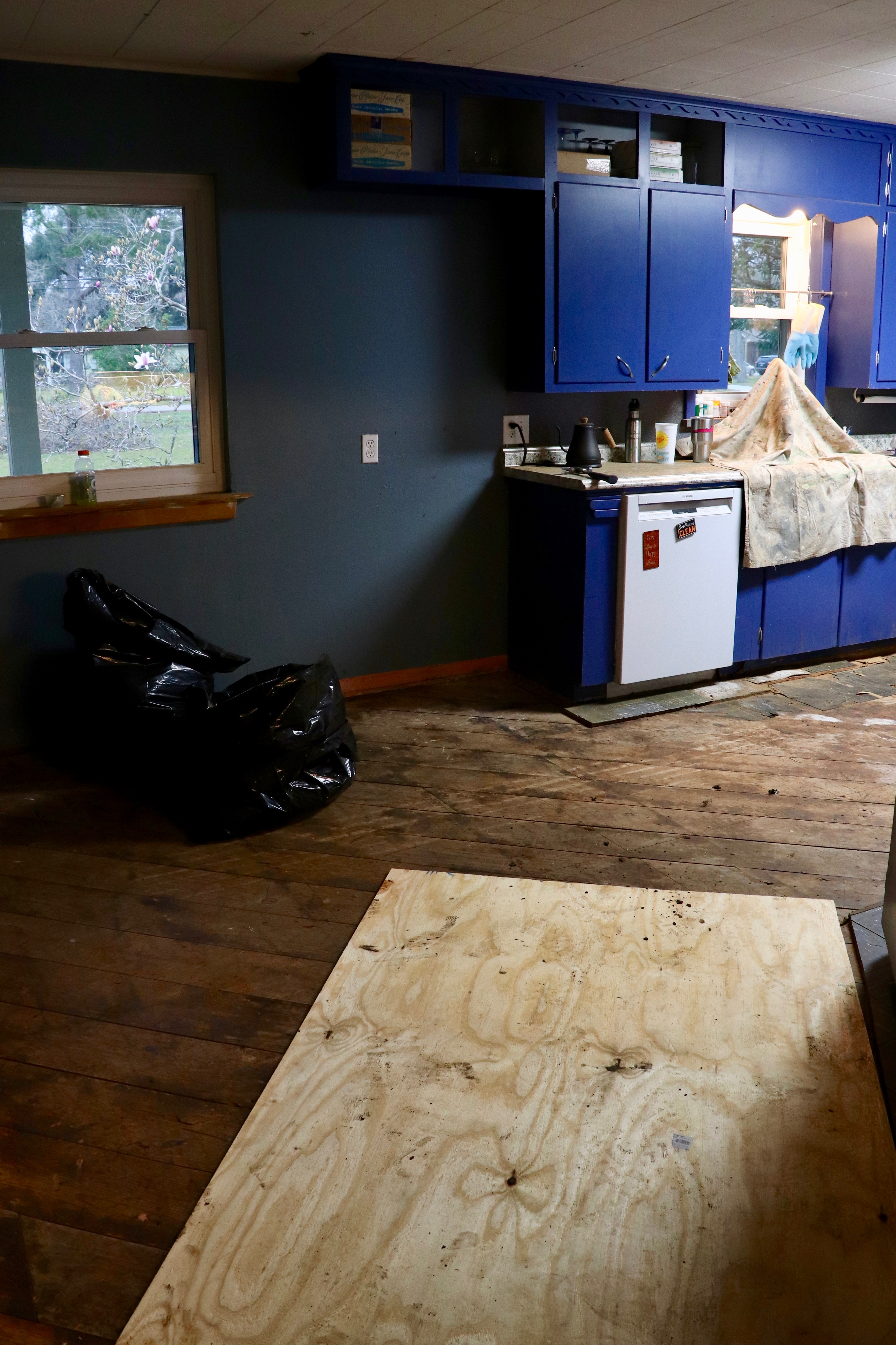 We have been dreaming of this day forEVER. We paid our last mortgage payment in October, enjoyed not having a mortgage for a couple of months, and then took out a small home equity loan to get Sally a new dress. Her crumbling blue siding was well past its prime, and she also needs some subfloor repair and new flooring. While we’re at it, we’re going to put up a beadboard ceiling!